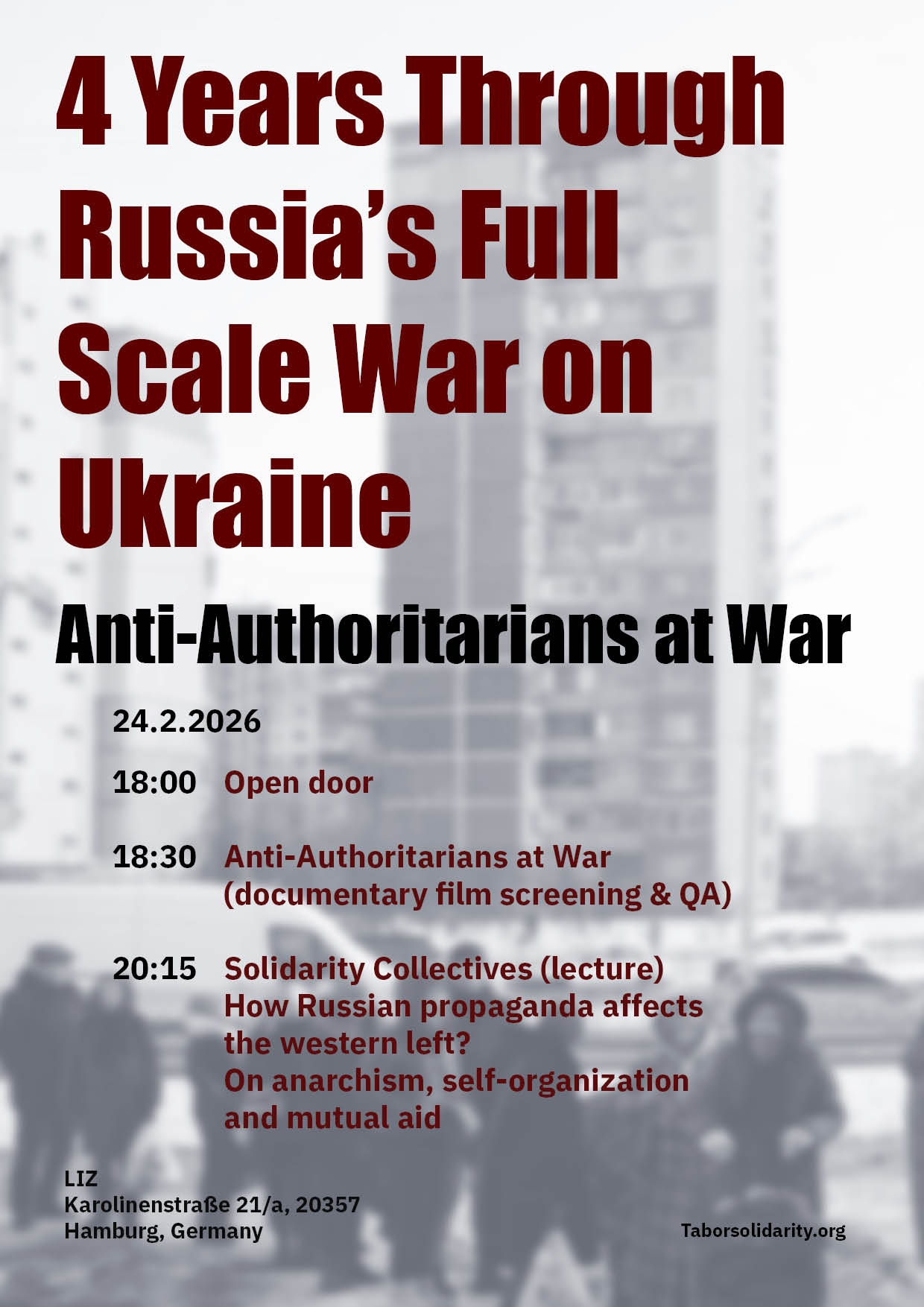 On February 24. 2022 the Russian full-scale war on Ukraine started. This winter, as Russia tries to freeze Ukrainians to submission, we are entering its fifth year. We consider it as our duty to support Ukrainian resistance, and we find it important for anyone outside Ukraine to learn from Ukrainian anarchists and anti-authoritarians, who have built the most effective, powerful and interconnected anti-authoritarian network in Europe. On 24.2.2026 we invite you to the screening of the film Anti-Authoritarians at War* and to the lecture by a member of Solidarity Collectives.
